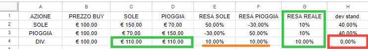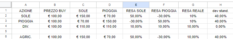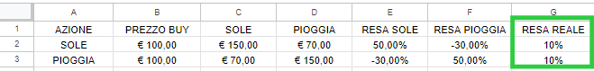 Ora, avendo ipotizzato che l’azione salirà a 150€ se l’anno è stato buono e scenderà a 70€ se l’anno è andato male, nella sezione “resa” verrà fuori la resa appunto percentuale, che ovviamente (ma lo si vede anche ad occhio) è del 50% in caso positivo e del -30% in caso negativo.