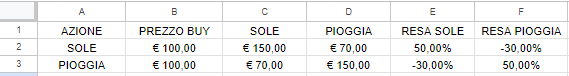 Ipotizziamo che il prezzo di acquisto delle due azioni sia il medesimo, cioè 100€ e che se andrà bene, il loro valore salirà a 150€ e se andrà male scenderà a 70€.