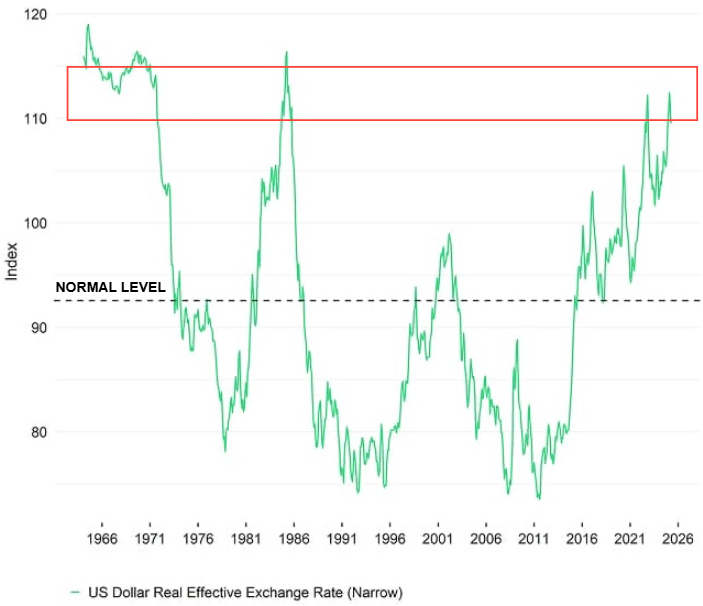Se però osserviamo la forza del dollaro aggiustata all’inflazione, il discorso cambia.