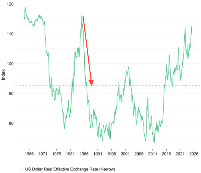Se andiamo a ritroso, vediamo che dopo gli Accordi del Plaza nel 1985, il dollaro si svalutò del 25% in appena due anni.