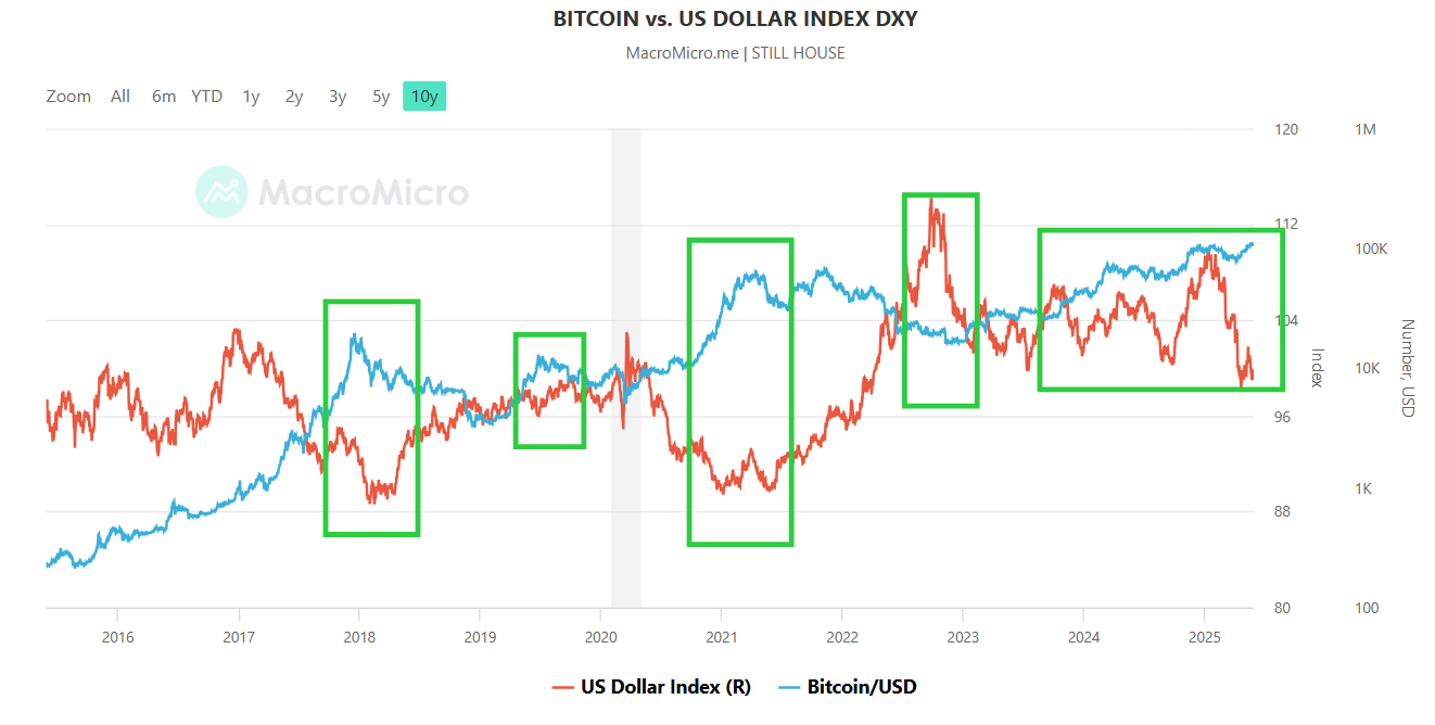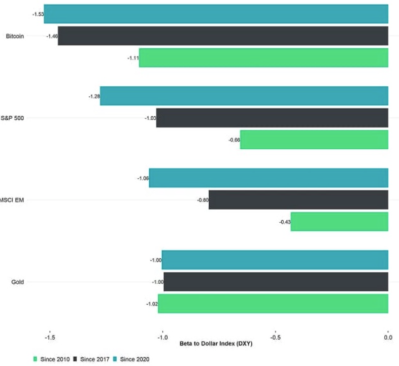 E reggiti forte perché secondo i dati storici (lo so, non sono molti su Bitcoin), per ogni calo del 10% del dollaro, Bitcoin può potenzialmente aumentare tra le 2 e le 4 volte.