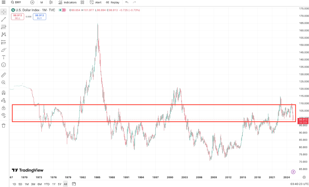 Questo che vedi qui sopra è il Dollar Index (DXY), che misura appunto la forza del dollaro rispetto le altre valute.