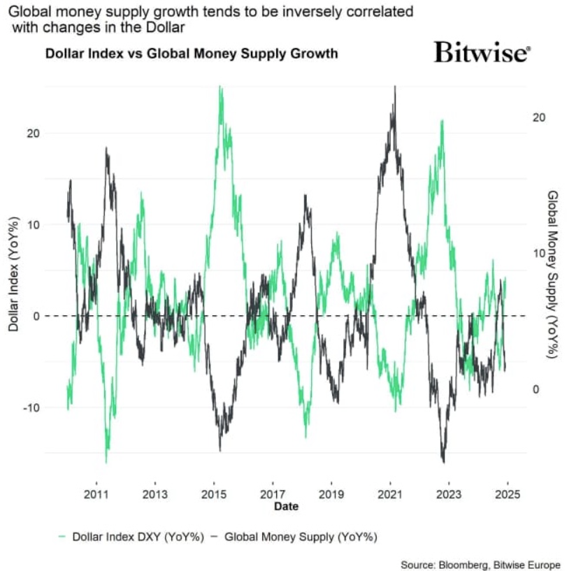 La Global Money Supply tende ad essere inversamente correlata al Dollar Index, come puoi vedere anche tu qui sotto.