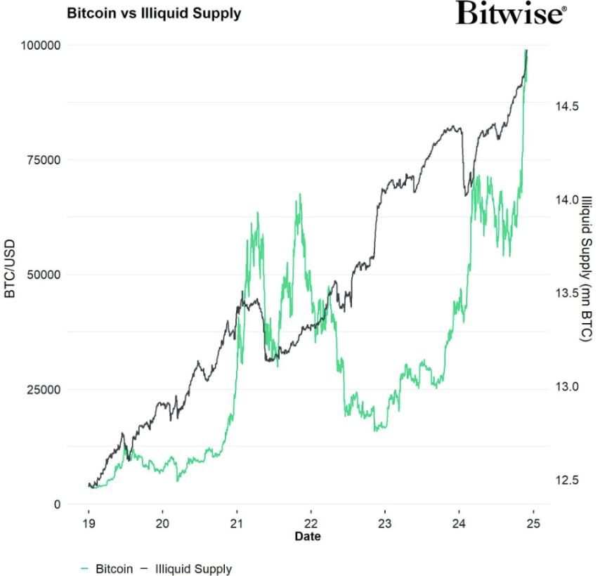 La liquidità sale (linea nera), quindi le valute fiat si svalutano e Bitcoin sale (linea verde).