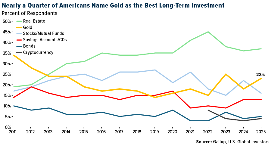 Secondo Gallup, nel 2025 quasi il 25% degli americani considera l’oro il miglior investimento a lungo termine, più addirittura delle azioni (e questo è comprensibile, viste le performance incredibili che ha fatto nell’ultimo anno).