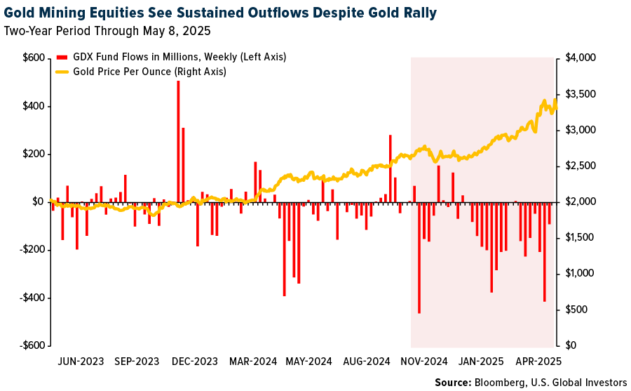 Ad esempio, l’ETF VanEck Gold Miners (GDX) sta registrando deflussi di capitale da tempo ormai, anche con l’oro sopra i 3.300 dollari l’oncia.