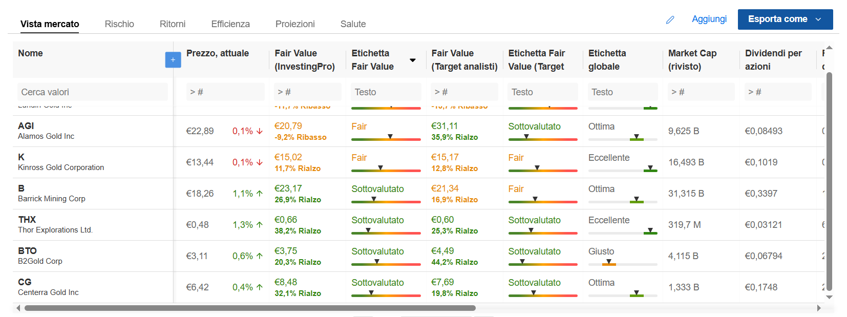 Come puoi vedere anche su Investing PRO (il software che uso per analizzare le aziende su cui posizionarmi e monitorare i portafogli dei big investor), molte aziende minerarie si trovano in una situazione di “sottovalutazione”.